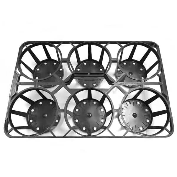 The 175mm to 180mm Shuttle Tray – 6 Cell with Handle is designed to securely hold pots ranging from 175mm to 180mm in diameter. Featuring six generously spaced cells to allow for full foliage growth, this sturdy tray improves handling efficiency while reducing plant damage. Built-in stabilisers keep pots firmly in place, and the integrated Tag Lock system allows for effective plant labelling. Ideal for retail display, transport, and automated fill lines.
