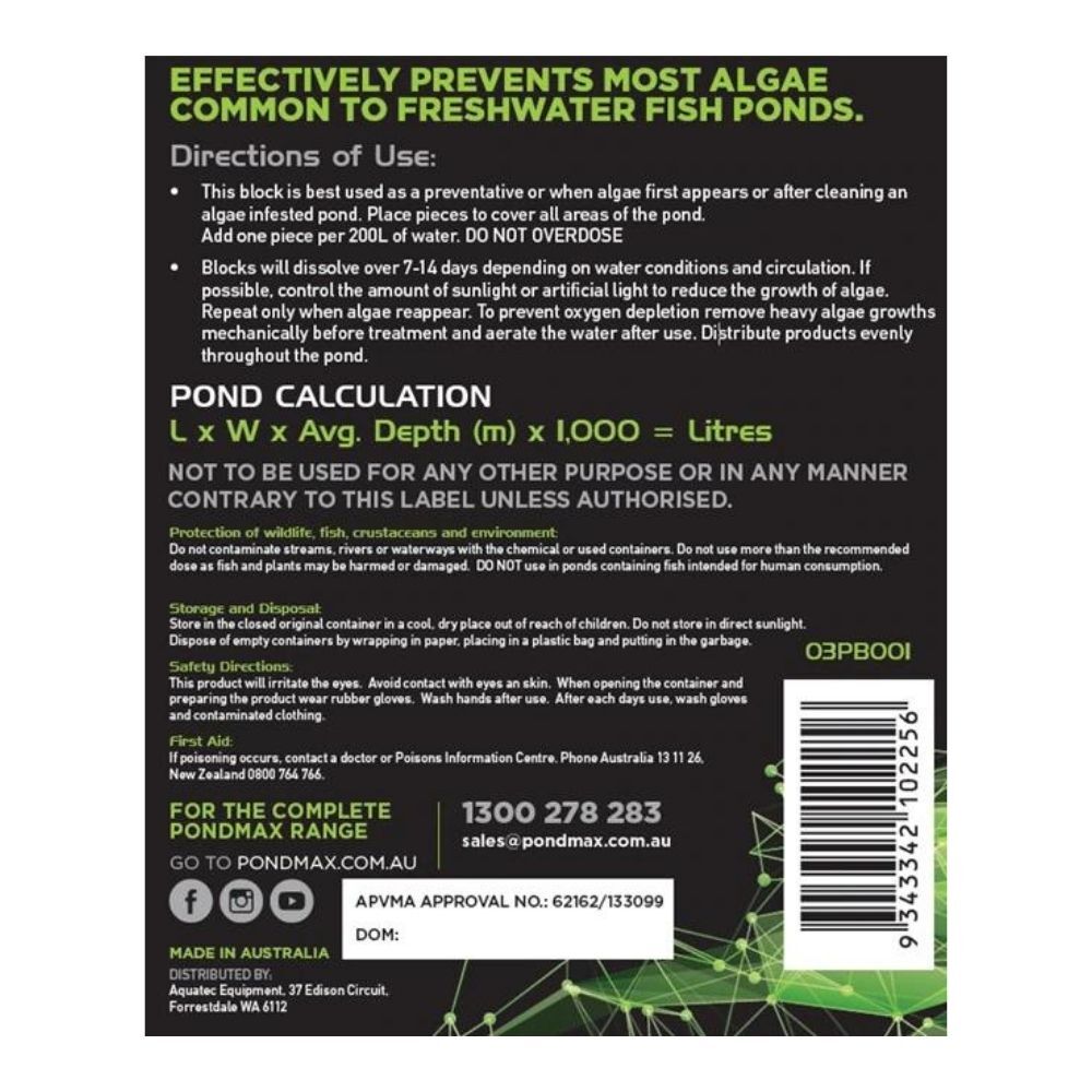 Greatly enhance your pond's aesthetic and health by using the PondMAX Algae Block. Designed to prevent and eliminate common freshwater algae, this simple solution will ensure that your pond remains crystal clear and suitable for fish and plants.