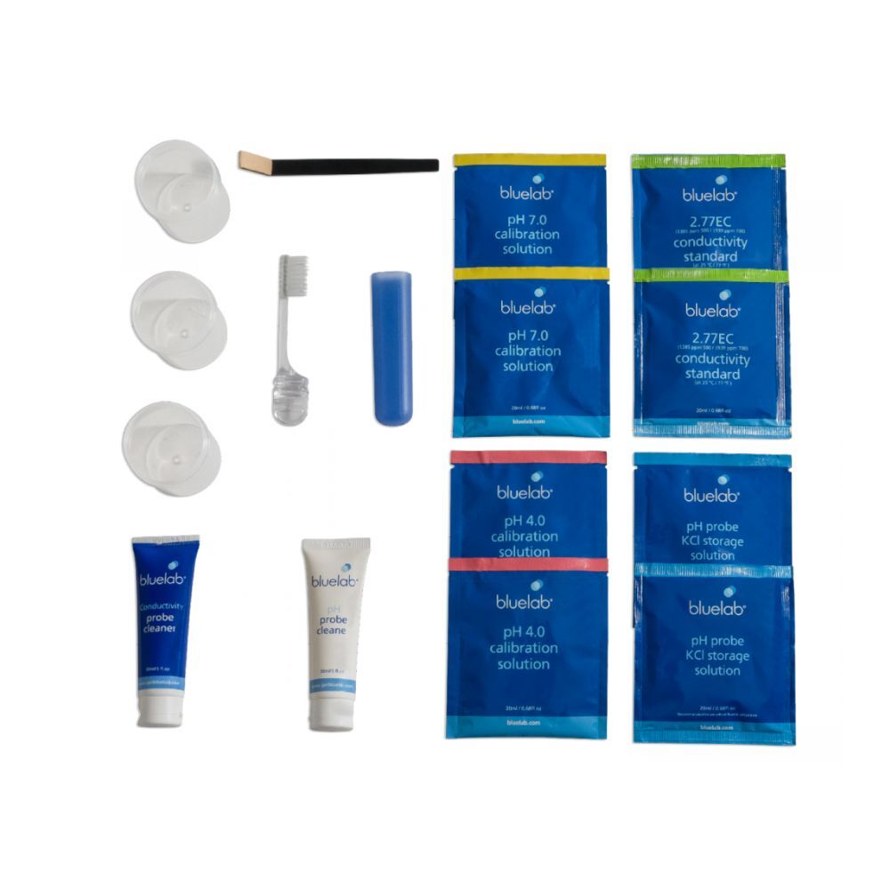 Probe care instructions, 20ml pH 7.0, pH 4.0, KCl, and 2.77 EC standard solution sachets, three plastic cups, Bluelab pH Probe Cleaner, Bluelab Conductivity Probe Cleaner, toothbrush for pH probe cleaning, chamois for conductivity probe cleaning, all-in-one kit for care, hydration, and calibration of Bluelab pH and conductivity probes