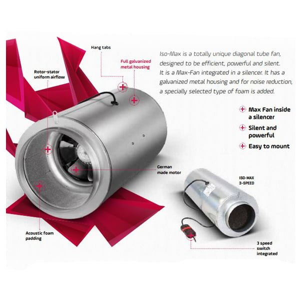 • Integrated Silencing: Built-in sound insulation within the metal casing reduces noise significantly, making Iso Max fans perfect for environments where low sound levels are essential.
