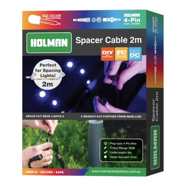 The Holman 2m 4-Pin Mini Spacer Cable adds flexibility to your RGB garden lighting system by allowing you to extend the distance between lights or branch out from a central connection point. Ideal for deck lights, pathway lights, and feature lighting, this spacer cable helps you achieve a clean and customised lighting layout. Featuring a secure 4-Pin Plug + Socket connection and an IP67-rated weatherproof design, it is built for easy DIY installation and reliable outdoor performance in all conditions.