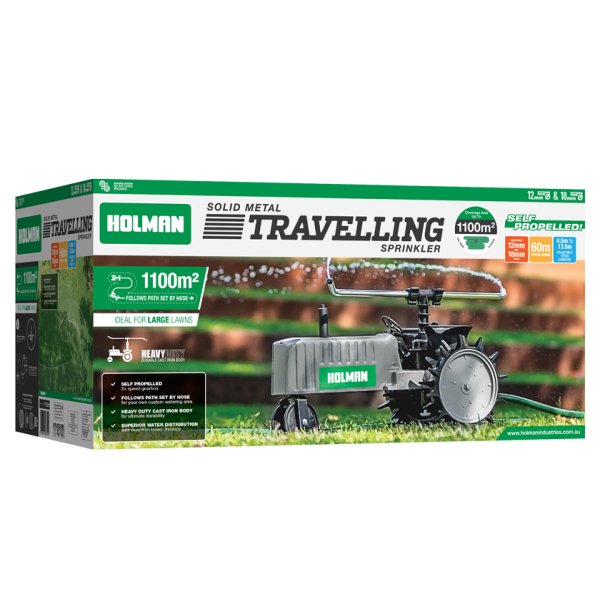 • The Holman Solid Metal Travelling Sprinkler takes the hassle out of lawn care. Designed to cover large areas without constant adjustments, it moves on its own, delivering consistent, even coverage across your entire lawn. Plus, its durable metal construction ensures it can handle harsh outdoor conditions, giving you reliable performance for years to come.