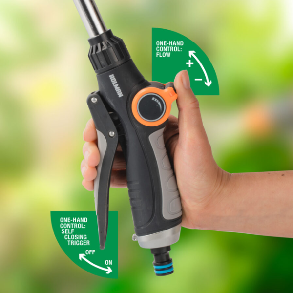 The Holman Tilt Head 850mm 8x Function Wand provides extended reach and versatility, ideal for watering hard-to-reach plants, hanging baskets, and garden beds. With eight adjustable spray patterns, a tilt head, and a comfortable thumb control for water flow, this wand makes garden watering efficient and convenient.