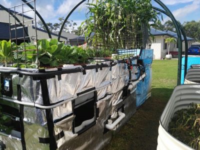 I now was pretty happy with the layout, and set about making it look presentable from the front, but still keep it so everything was accessible from the back in case I needed to change anything. 25mm flexible pipe distributes water around the system, all beds are flood and drain utilising bell siphons, and a 10,000LPH pumps water around the system. A supplementary 5000LPH pump is also in the system, but that is for added water distribution when the fingerling tank is in use. The main tank has a external 50mm SLO, and the fingerling tank has a internal 50mm one. More air was added due to the dual MBBR setup and the higher fish stocking density. As it sits now it has the filtration capacity to grow out 136 fish to 1kg, but as of yet, I haven’t tried pushing it that far, nor do I intend to. Also at this stage my Aquapondics system came to live next to it.