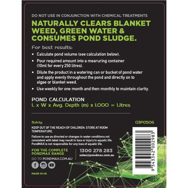 A universal all in one treatment that clears green water plus string algae and consumes pond sludge.