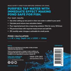 • Dosage: Add 10ml to 120L of water when setting up or new water is added to pond. Agitate water slightly for even distribution.
