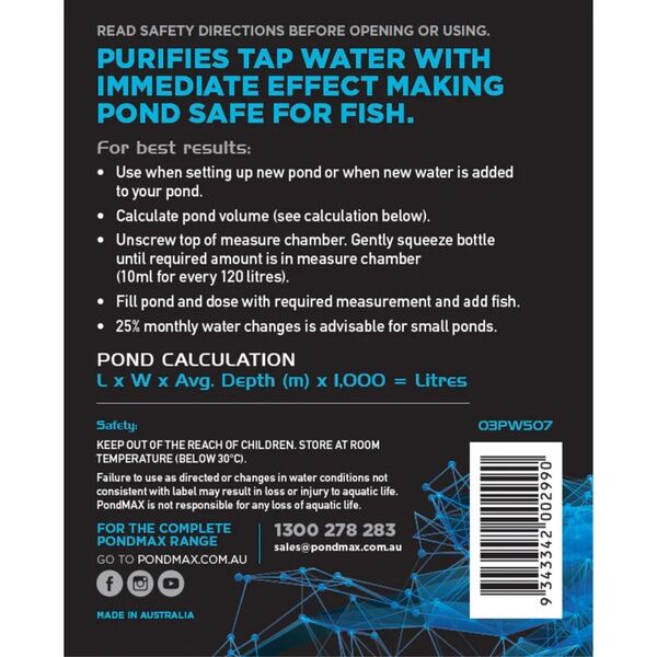 • Dosage: Add 10ml to 120L of water when setting up or new water is added to pond. Agitate water slightly for even distribution.