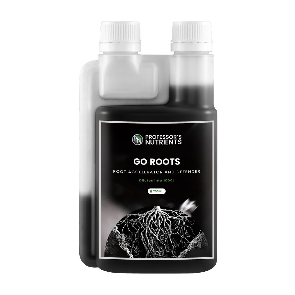 Professors Go Roots is a powerful root stimulator designed to promote rapid root growth, increase root mass and protect your plants from disease throughout their entire life cycle. Available in 100ml, 250ml, 500ml, and 1L sizes, this advanced formula contains purified Humates, Fulvic Acid, and a specialised fungicide to promote and protect your plant's root system.