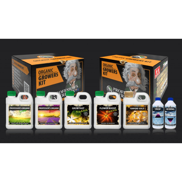 The Professor's Nutrients Organic Growers Kit includes: Organic Grow 1 Litre, Organic Bloom 1 Litre, Organic Grow Fast 1 Litre, Organic Flower Boost 1 Litre, Organic Terpene Gold 1 Litre, Organic pH Up 250ml, and Organic pH Down 250ml.