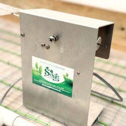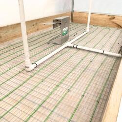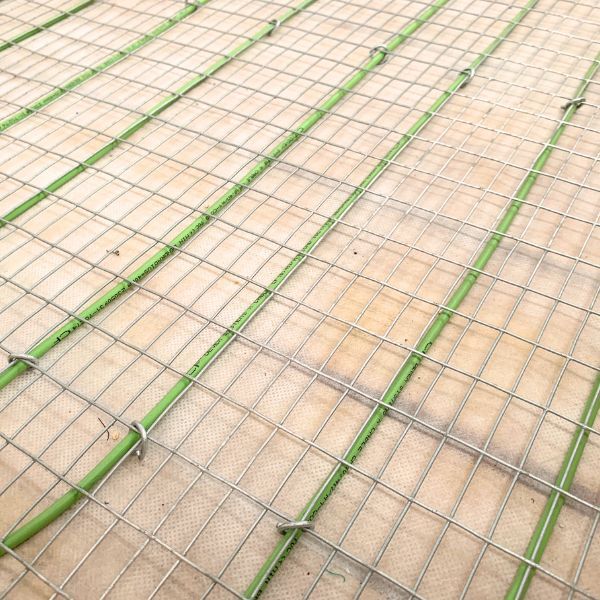 On top of the polypropylene is the heating cable clipped to mesh. The cable is spaced specifically according to the size of the bed to provide an even heat source to all the plants that are placed in the bed. The mesh is used to assist with the heat exchange from the cable to the medium, to ensure the heat radiation is spread evenly across the bed. Also clipped to the mesh is the thermostat temperature sensor that enables the thermostat to operate according to the setting position on the thermostat dial.