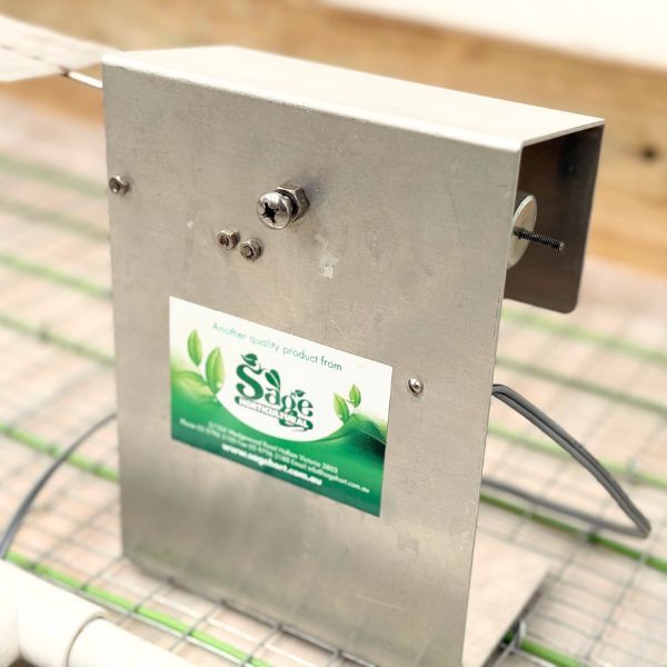 On the outside of the treated pine bed is the thermostat control for the heated cable. Extending out from the thermostat is a lead and 240VAC plug. This plug should be be plugged directly into a power supply socket or a minimum length of extension lead to reach the desired power source. You will also find a plumbed Solenoid Valve feeding the two Mist Jets on 500mm high, 15mm diameter P.V.C. risers that requires access to mains water for supply to the watering system.