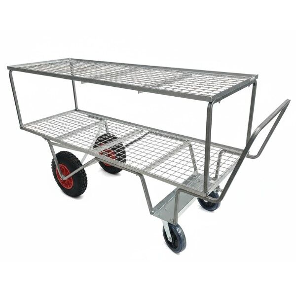 The 4-Wheel Dual Level Rail Top Barrow is a premium logistics solution designed for high-efficiency stock movement. This specialized model features a "no side frame" design on the base level, specifically engineered for the effortless loading and unloading of heavy or bulky items from the side. Combined with a massive 6ft length and a secondary upper tier, this barrow offers maximum surface area and unmatched versatility for professional nurseries and commercial operations.