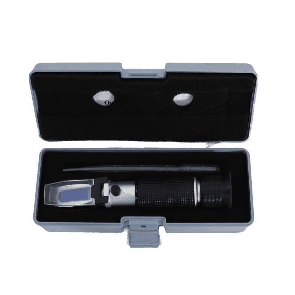 Handheld refractometer for measuring the amount of dissolved solids in fruits and vegetables, particularly useful for sugar levels in grapes. 0-32% Brix measurement range with 0.2% accuracy.