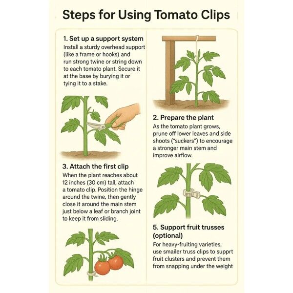 Tomato clips are used to secure tomato plant stems to trellis strings, stakes, or support wires. They help guide vertical growth, prevent stem breakage, and improve airflow around the plant.