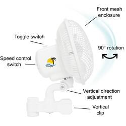 It provides vital airflow to prevent heat issues and stress on plants, Reduces heat waves and hot spots, Improves plant growth, eliminates dead spots and mold growth, perfect for grow tents/rooms, 150mm diameter blades, Fully enclosed, 20W power usage, 90° oscillation, vertical clip for tent poles, AU 2 Pin plug, Can also be used for workbenches, desktops, kids' rooms, bedrooms, small rooms/cubbies