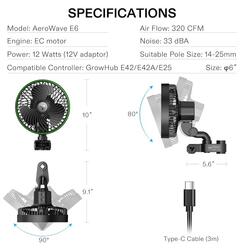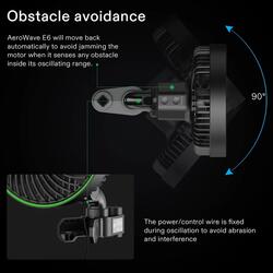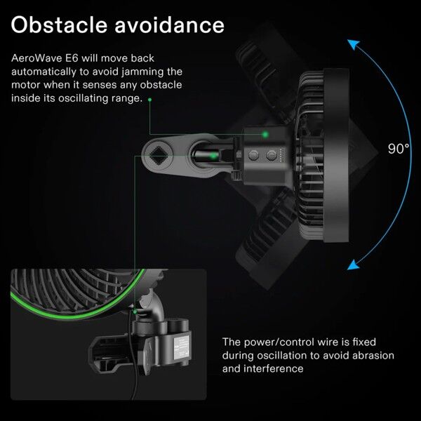 The AeroWave E6 is built with an "Oscillating Isolation" design, which separates the moving parts from the motor housing to reduce mechanical wear and tear. This, combined with the obstacle avoidance system—which stops the fan if it hits a tent wall or plant—ensures a long service life and prevents damage to your grow space. The 12V DC power supply significantly reduces the risk of electrical issues in high-humidity areas.