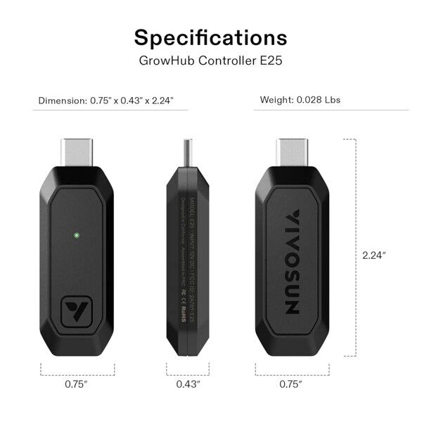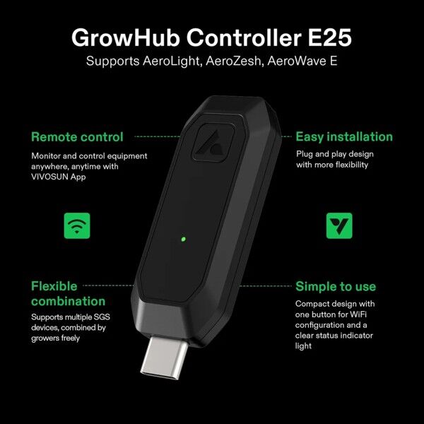 The VIVOSUN GrowHub E25 is a compact, WiFi-enabled controller designed to bring intelligent automation to your indoor garden. Engineered as a modular expansion for the VIVOSUN Smart Grow System (SGS), the E25 allows you to integrate and control essential equipment like the AeroZesh inline fan and AeroWave E circulation fans. Whether you are adding more devices to an existing setup or looking for a streamlined, app-driven control hub, the E25 provides the connectivity needed to optimize your grow environment.